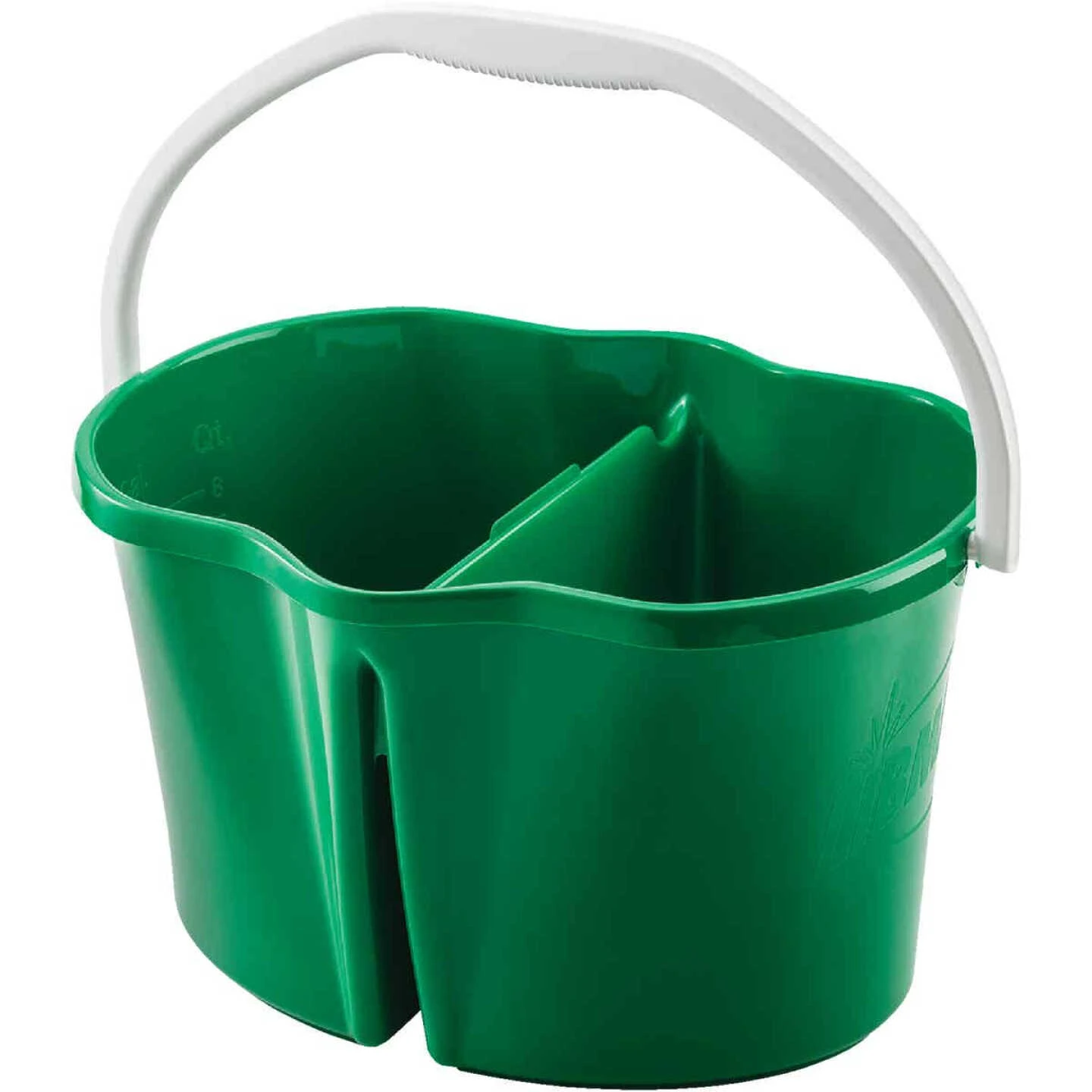 The Libman 4 gal (gallon) Clean and Rinse bucket has a divided middle to keep clean and dirty water separated. It is virtually 2 buckets in one. Each side holds up to 2 gal. Never put dirty water on your floor again. This bucket is excellent for all mop types.