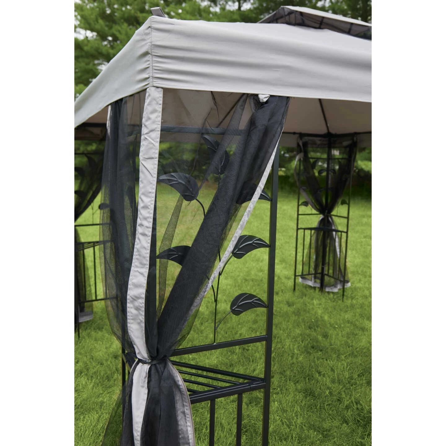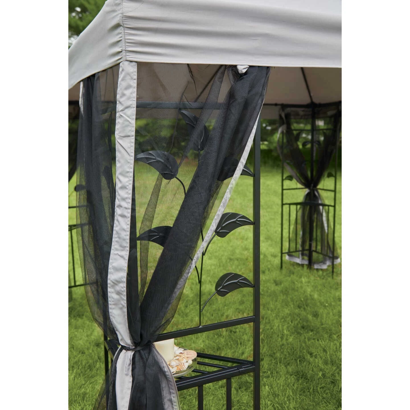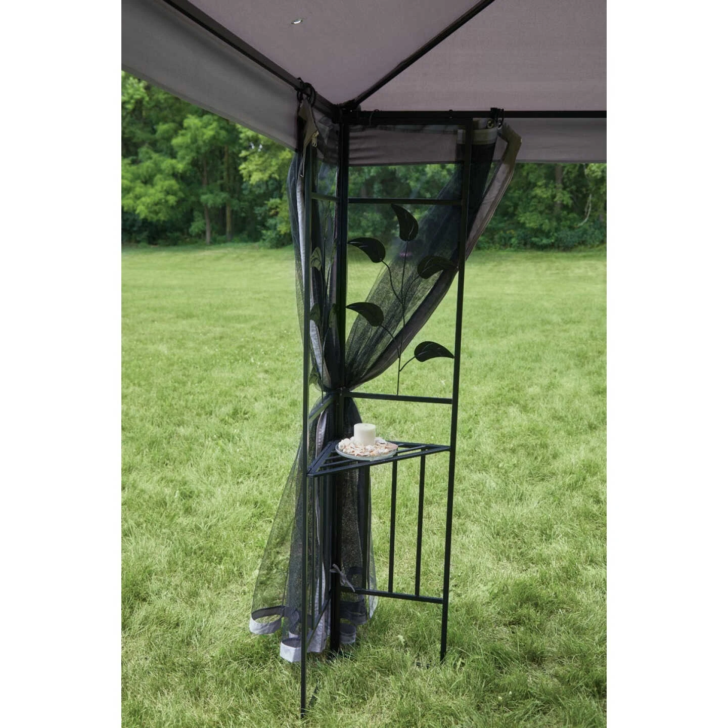 Durable steel framed gazebo. Features tough 180-gram gray polyester fabric and a black powder coated durable steel frame. Includes shelving in each corner and mosquito netting sides to keep out pesky insects. Ideal for any deck, patio, or backyard to protect you from the sun’s rays, rain, and mosquitoes while entertaining or enjoying the outdoors.