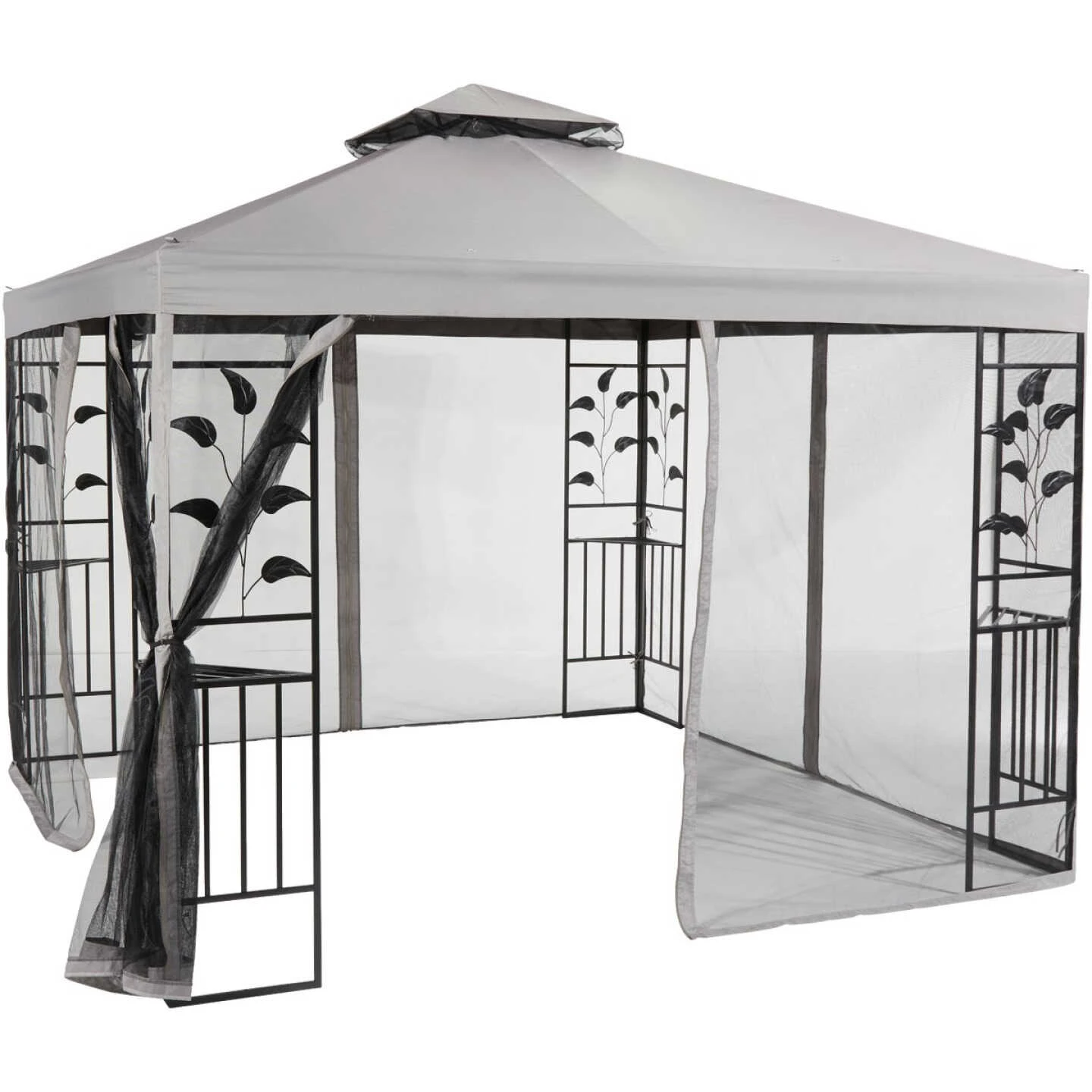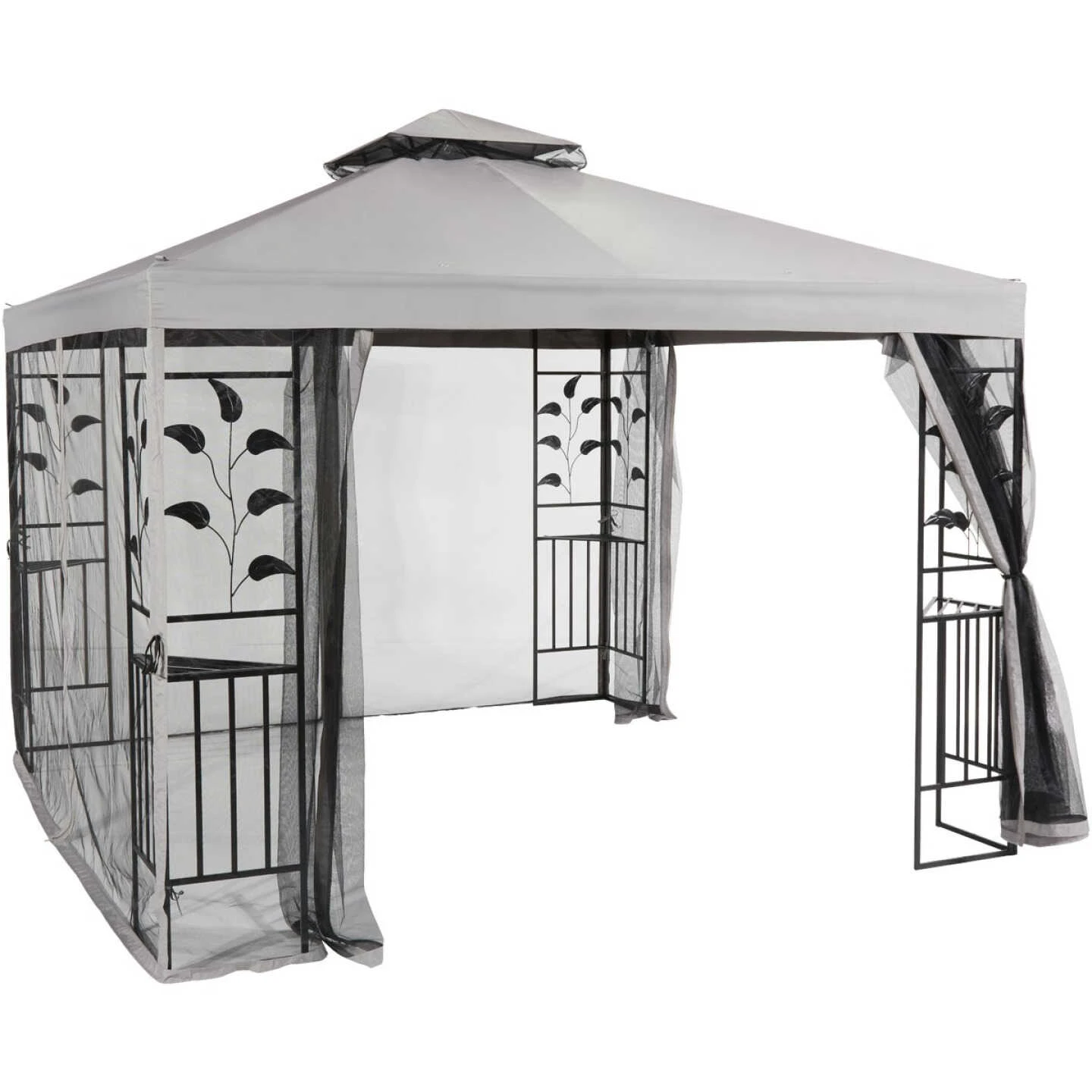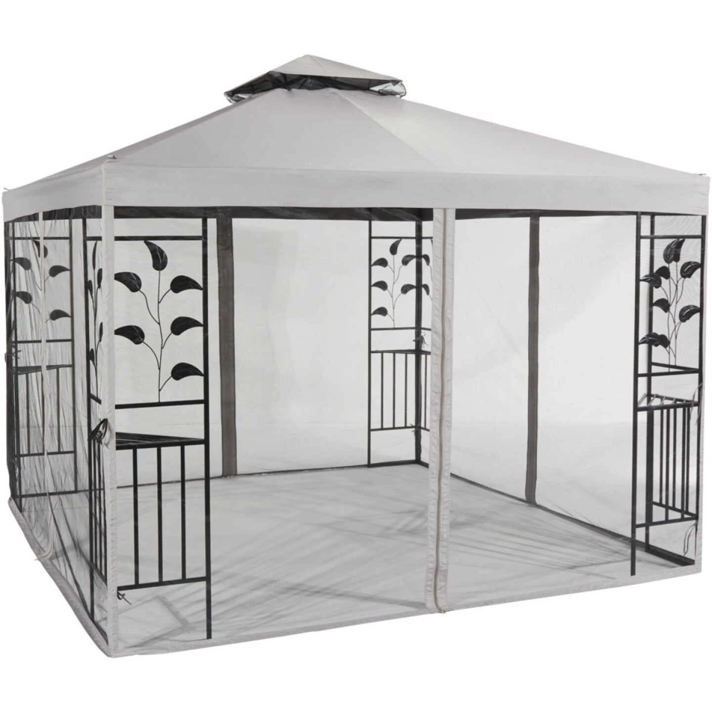 Durable steel framed gazebo. Features tough 180-gram gray polyester fabric and a black powder coated durable steel frame. Includes shelving in each corner and mosquito netting sides to keep out pesky insects. Ideal for any deck, patio, or backyard to protect you from the sun’s rays, rain, and mosquitoes while entertaining or enjoying the outdoors.