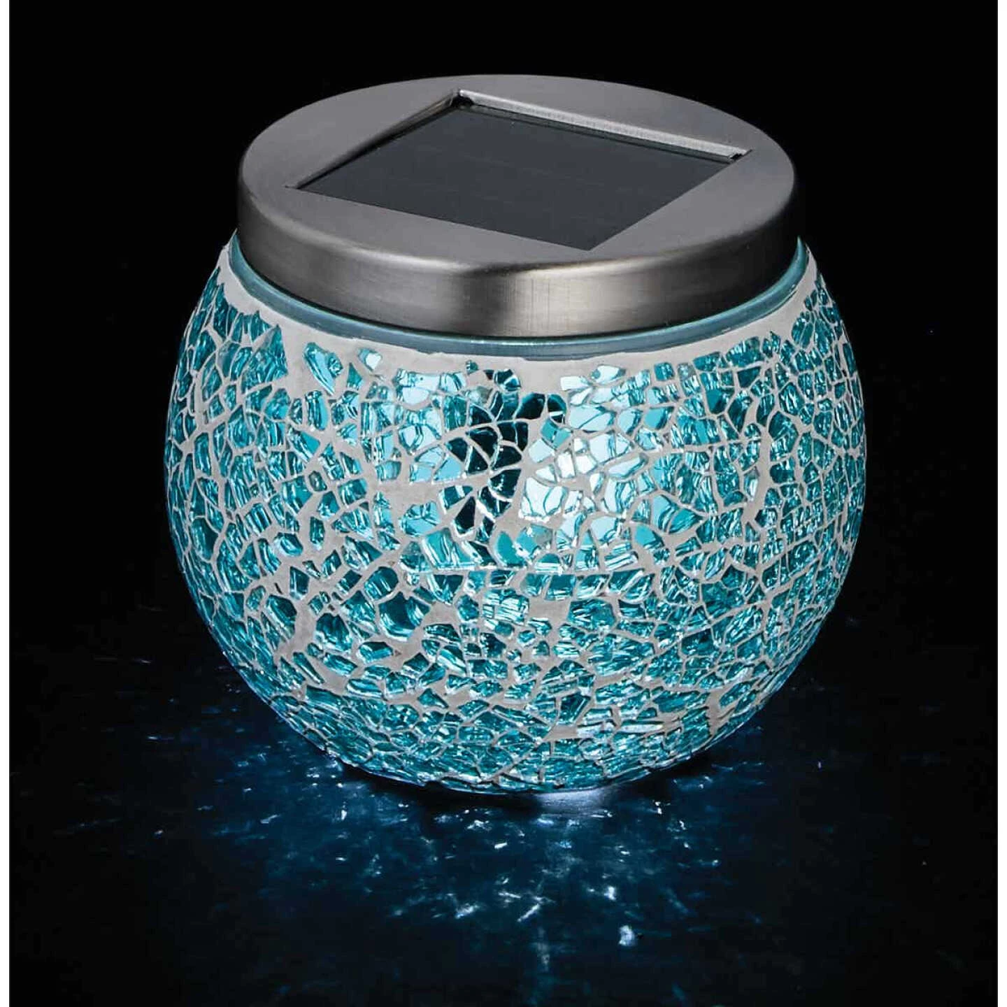 Decorative solar powered tabletop glass globe light. Features a 2.10-lumen LED (light emitting diode) light that recharges by sunlight and lights at dusk with automatic On/Off switch. Requires (1) AA 1.2V Ni-Cd rechargeable battery, included.