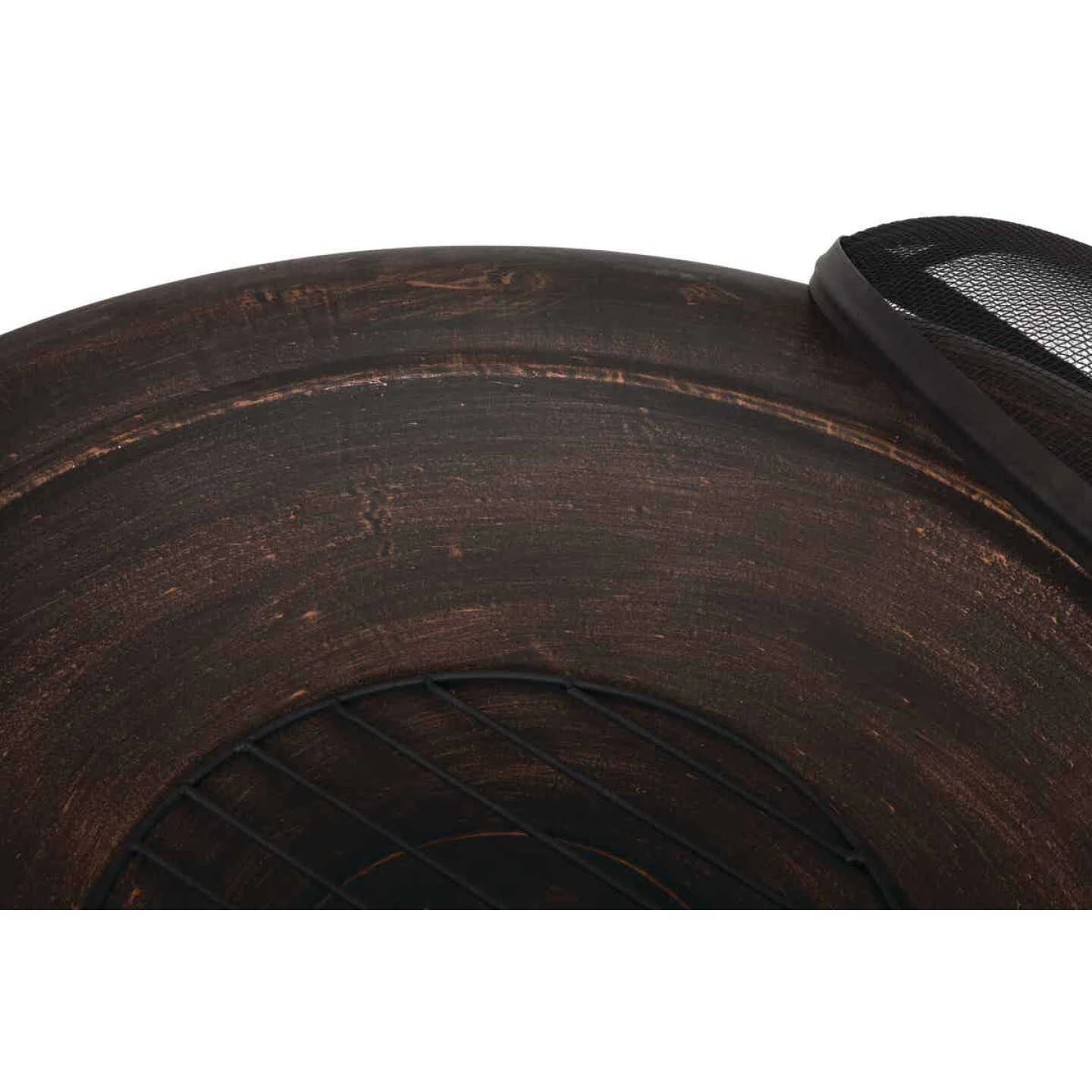Round fire pit is constructed of steel with an antique bronze finish. Includes mesh cover, wood grate, and fire poker. 13.5 In. H. x 30 In. diameter without fire screen.