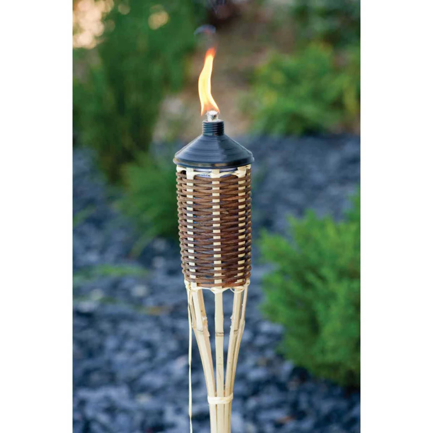 Brown rattan weave basket patio torch. Features a spiked tip natural bamboo pole for easy set-up. 60 inches tall. Includes a metal, removable, refillable canister with a fiberglass wick and bamboo cap. Ideal to light up decks, patios, and backyards. Also helps control mosquitoes and other insects when citronella fuel is used.