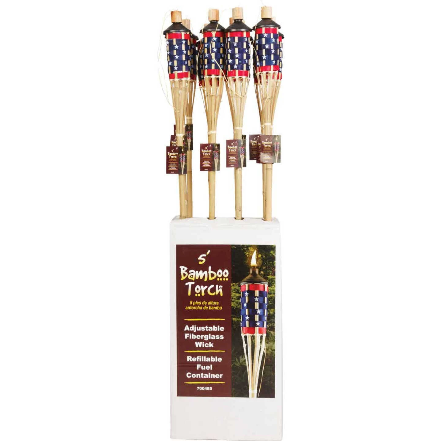 Bamboo patio torch featuring a rattan weaved natural canister basket. Includes a refillable metal fuel can with a fiberglass wick and bamboo cap. Ideal to light patios, decks, and backyards. Also controls mosquitoes and other insects when citronella fuel is used. 5-feet tall.
