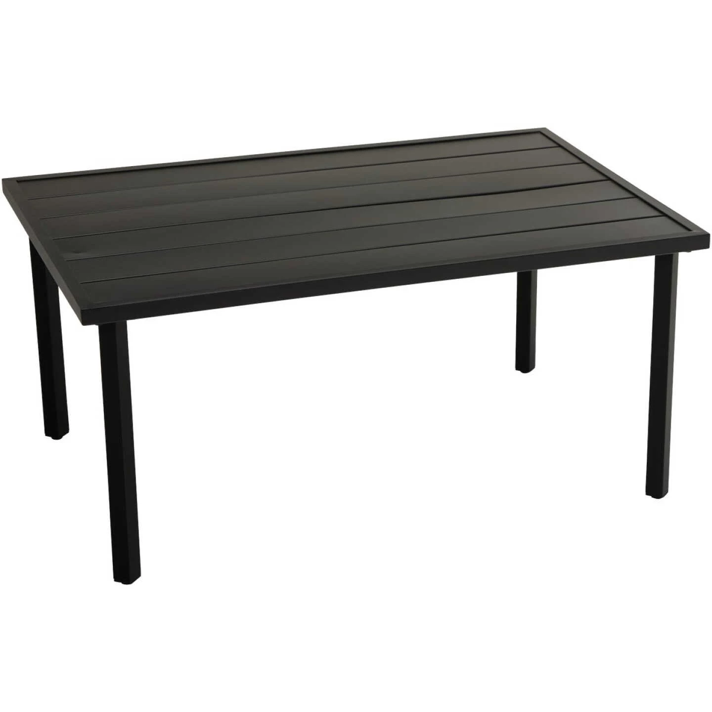 Outdoor Expressions Azure Brown Chat Set. Set includes: rectangle steel slat table, 1 cushioned love seat and 2 cushioned chairs. Black frames with brown polyester cushions.