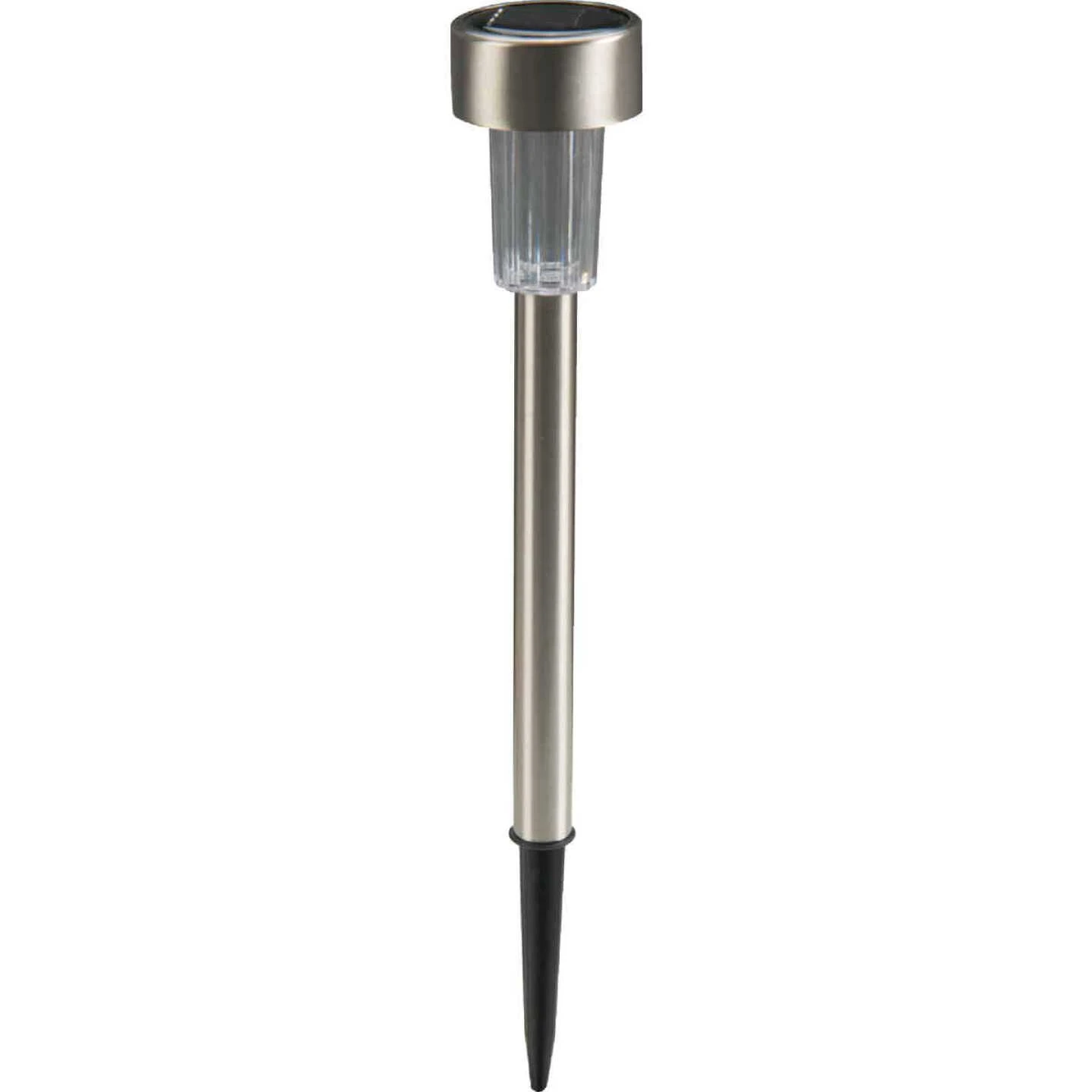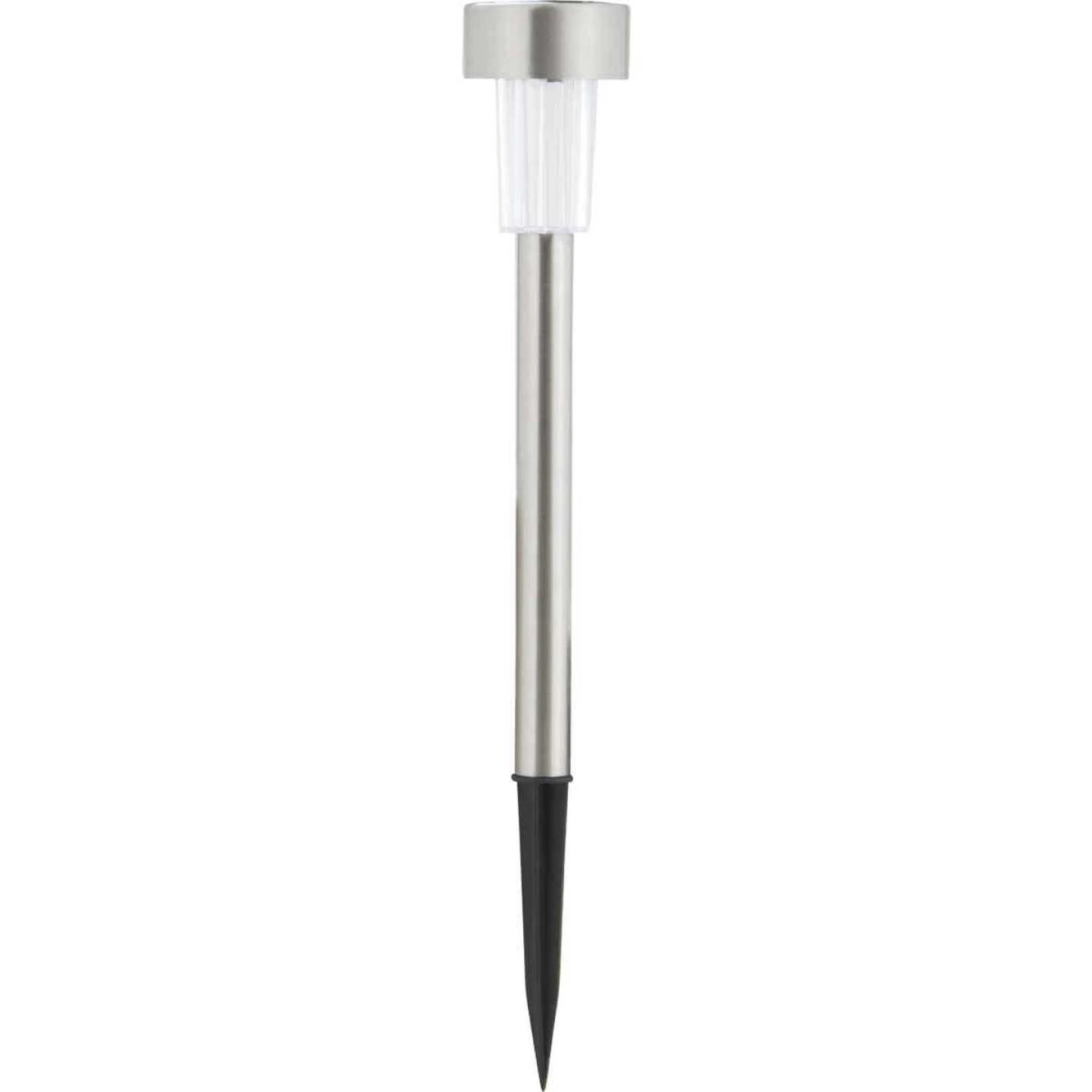 Solar powered mini stake light recharges by sunlight and automatically turns On at night. Features bright white LED (light emitting diode) technology that illuminates for up to 10 hours with fully charged batteries. Durable metal stake with spike inserts easily into the ground for quick installation. Uses (1) AAA 1.2V NiCd rechargeable battery, included.